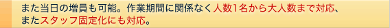 お客様に、弊社との間で請負契約を結んでいただきます。その後、詳しい業務内容をお伺いして、必要な人数をキャスティングします。弊社の裁量と責任において請け負った業務を完遂させます。